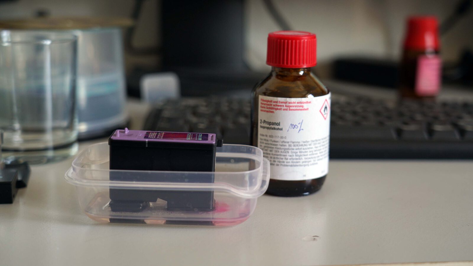 Bei stärkeren Verschmutzungen muss man den Druckkopf längere Zeit, am besten mehrere Stunden oder gar über Nacht in Alkohol einweichen. Dafür nimmt man ein kleines flaches Schälchen (z.B. Plastikbox), welches möglichst kaum größer ist als der Druckkopf, füllt dieses dann so hoch mit Alkohol, dass die Düsen in der Flüssigkeit sind, also 3-4 Millimeter hoch. Nach dem Einweichen die Düsen vorsichtig abtupfen. Keinesfalls sollten die Kontakte noch mit Flüssigkeit benetzt sein. Erst in trockenem Zustand die Patrone wieder einsetzen. Auch dies darf nur in der dafür vom Drucker vorgesehenen Position erfolgen. Wenn man möchte, kann man jetzt noch den Software-Reinigungsvorgang des Druckers durchlaufen lassen, aber falls die Patrone auch ohne diesen wieder gut druckt, dann kann man sich das (und damit teure Tinte) auch sehr gut sparen.