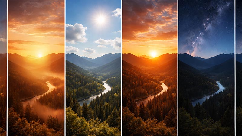 Erfahrene Kameraleute wissen bei Außenaufnahmen das weiche Licht der Morgen- und Abenddämmerung zu schätzen. Da erhalten sie ein besonders plastisches Streiflicht. Wenn der Charakter und die Dauer der Arbeit an einer Einstellung oder kurzen Szene es erlauben, sollte man stets versuchen, das zauberhafte Licht des Morgens zu nutzen. Ist man statt dessen eher an hoher Farbsättigung und stärkeren Kontrasten interessiert, ist Auflicht angesagt, anzutreffen vor und nach der Mittagszeit.