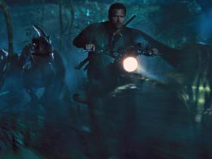 Fans des Originals dürfen sich an mehreren Anspielungen und Verweisen erfreuen, tauchen doch etliche Utensilien und Motive wieder auf, sei es in Form von Fahrzeugen, Sichtgeräten oder T-Shirt-Logos. Wo sich "Jurassic Park" allerdings noch einen wissenschaftlichen Anstrich verpasste und auf den gruseligen Schauder der möglichen Machbarkeit setzte, versuchte man hier nicht mal im Ansatz, so etwas Ähnliches wie Plausibilität zu erzeugen: Das Zauberwort 'Gen-Manipulation' dient hier als profane Dauer-Erklärung für jede noch so abstruse Eigenschaft der selbstgezüchteten Wunder-Dinos, die sich zur Not auch in einen chamäleon-artigen Tarnmodus versetzen können (es aber seltsamerweise nicht tun, wenn es wirklich mal sinnvoll wäre). So clever das Skript auf der Meta-Ebene konstruiert wurde, so einfallslos ist es dann auch im Abarbeiten seiner einzelnen Stationen: Die Helden geraten in Bedrängnis, entkommen in letzter Sekunde, verschnaufen kurz und sondern Weisheiten ab, bevor das Spiel von Neuem beginnt. Das war zwar im Original kaum anders, doch bot dieses auch Figuren, denen man dabei folgen wollte. Obwohl Chris Pratt durchaus als Sympathieträger taugt und Bryce Dallas Howard in manchen Momenten ganz entzückend ist, solch schillernden Charakteren wie Ian „Jeff Goldblum“ Malcolm oder Alan „Sam Neill' Grant werden sie in keinem Augenblick gerecht.