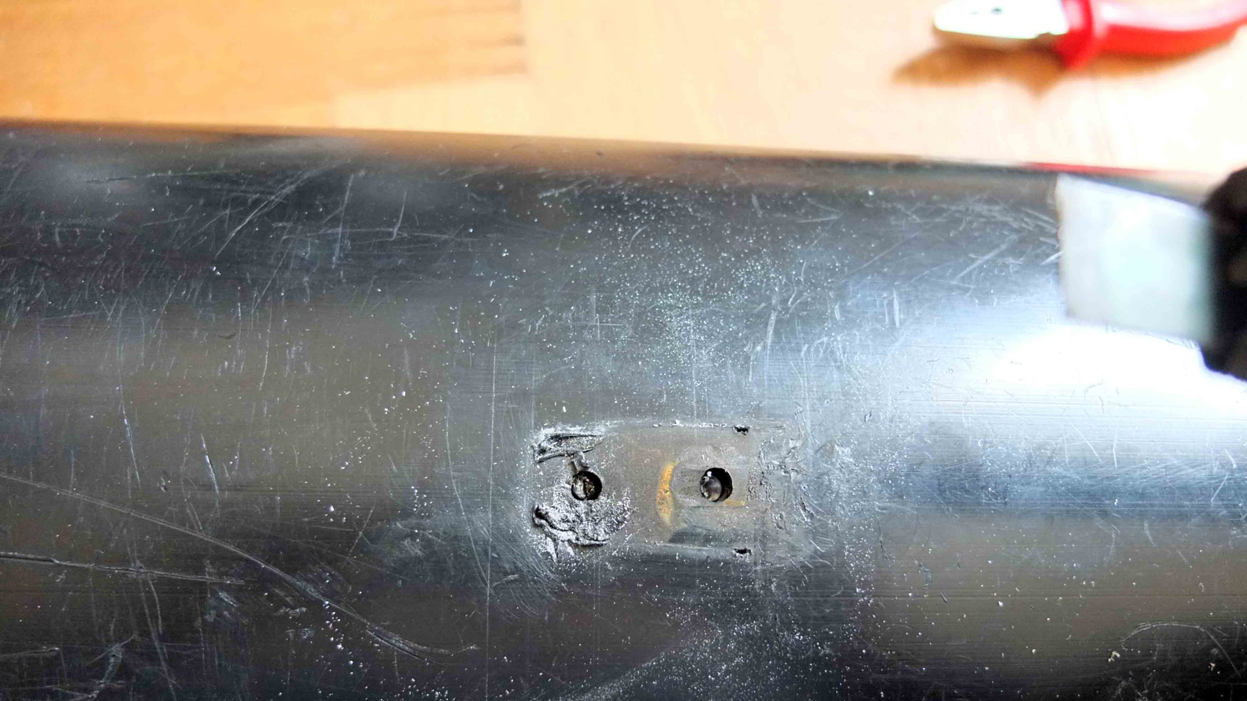 Da der neue Griff etwas länger ist, passen die Bohrungen nicht vollständig überein. Die Bohrungen auf einer Seite können verwendet werden, auf der anderen Seite der Befestigungen muss zumindest ein neues Bohrloch in den Köcher-Body sowie in die Plastik/Alu Schiene hinzugefügt werden. Dafür setzt man die neue Schiene auf den Köcher und zeichnet das neue Bohrloch sorgfältig an. Bohren und anschließend die Schiene passgenau innen gegenhalten (Bohrlöcher müssen zu sehen sein) und das neue Bohrloch mit Filzstift anzeichnen. Dann auf der Schiene das Bohrloch nach der Markierung bohren.