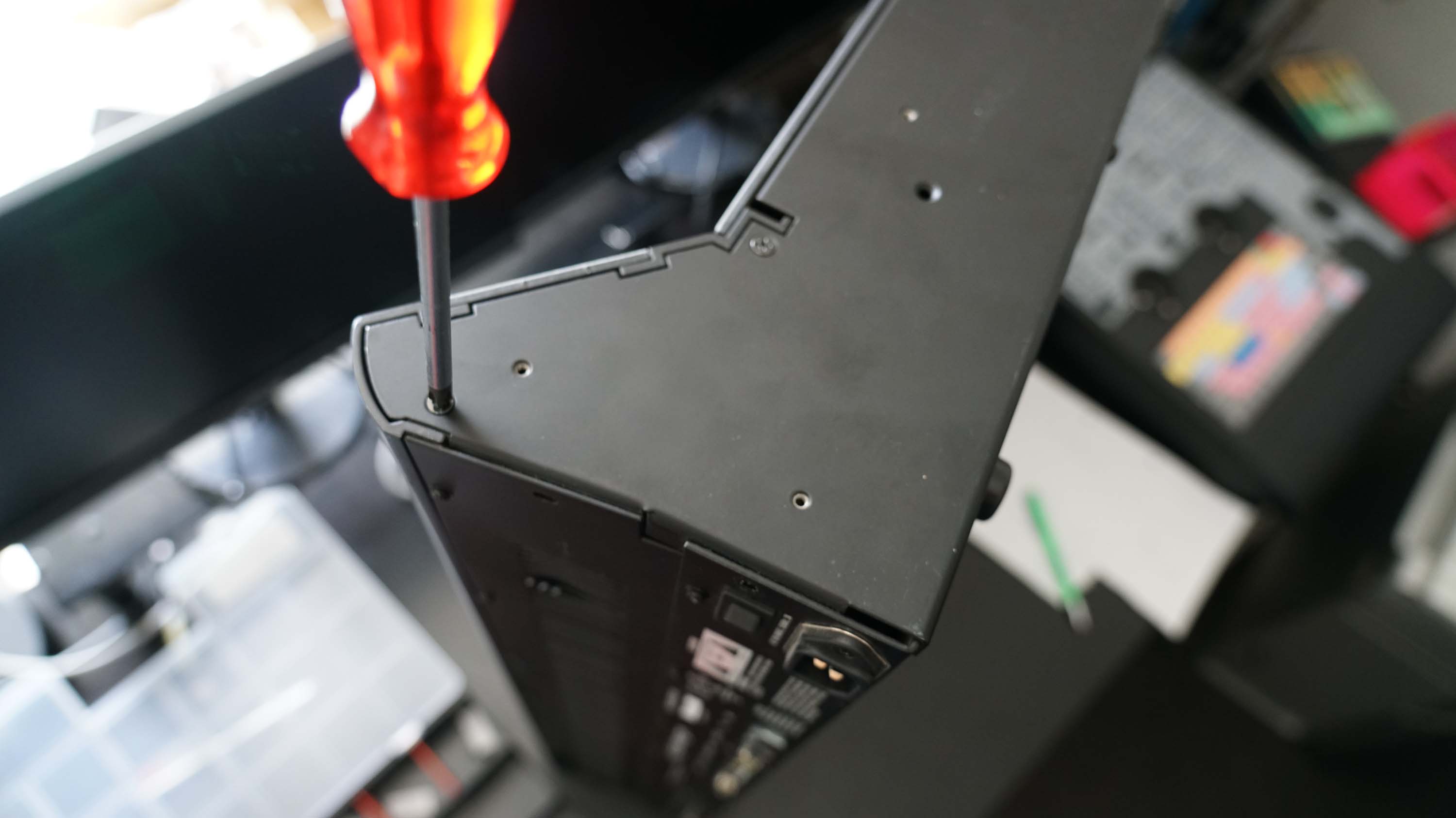 Da das Netzteil sich in unmittelbarer Nähe des Netzanschlusses befindet, löst man erst einmal die Schrauben auf der Rückseite rechts, also jene, die auch die seitliche Abdeckung fixieren. Übrigens lohnt es sich absolut, ein Sortierkästchen zu benutzen und die einzelnen Fächer zu beschriften mit: Rückseite, Rechte Seite, Obere Abdeckung, Faderabdeckung, Tastenabdeckung sowie Netzteil. Dann kann man nämlich die vielen Schrauben, die es dann doch werden, so einsortieren, dass man beim Zusammenbauen hinterher, keine Probleme hat.