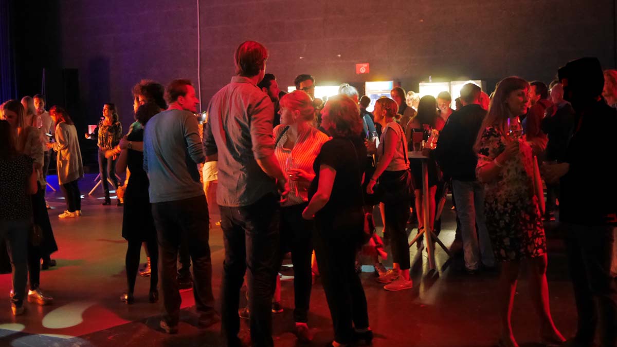 Leider ist am Anfang das Gedränge im Foyer der HFF mit seiner unterirdisch halligen Akustik sehr groß, sodass man kaum ausmachen kann, wer alles etwa vom eigenen Kurs da wäre. Auch wurde nichts vorgesehen, wie sich Ehemalige verschiedener Kurse auf dem Event wiederfinden könnten, nach teilweise 40 Jahren und mehr, ist es nicht selbstverständlich, dass man sich wiedererkennt.