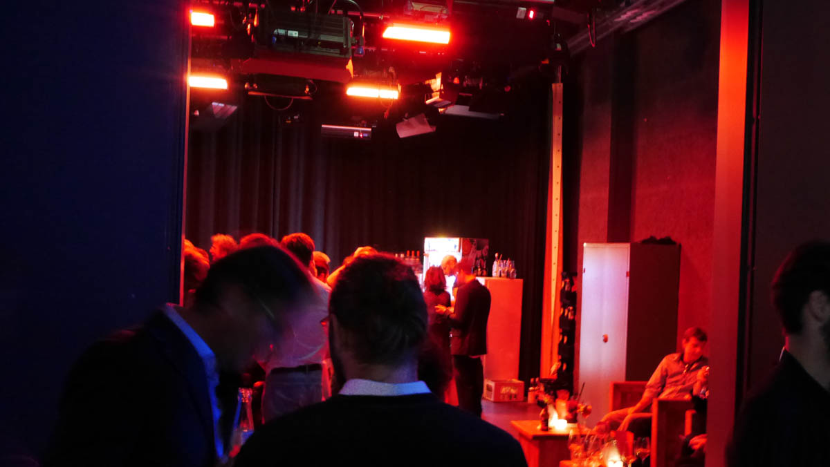 So versuchte Jeder möglichst lautstark gegen den Schall im Foyer anzureden, was Gespräche doch eher etwas anstrengend machte. Farbiges Licht im Foyer, dem Gängen, im Studio und Außen sorgte für interessante Lichteffekte, insbesondere der Gang zum Studio war visuell spannend mit Lichtsäulen gestaltet.