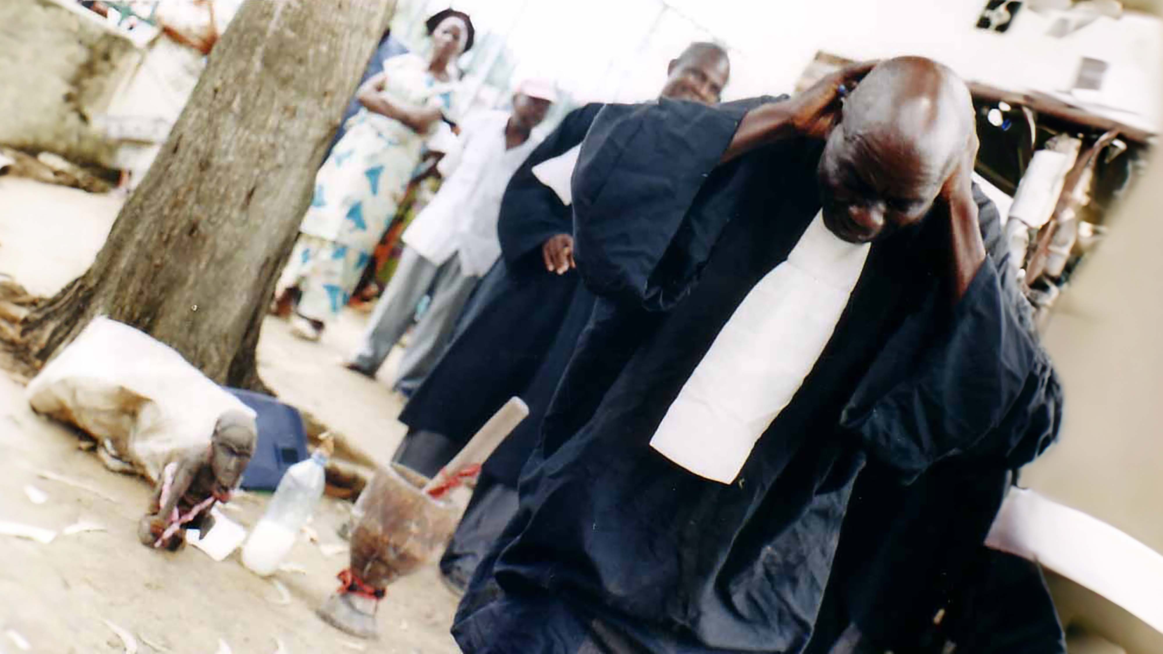 Ich bin durch Zufall auf diese Thema gestoßen. Ich bin darauf aufmerksam geworden, als ich durch Tenrikyo kam, dieses bekannte und populäre Viertel von Brazzaville. An einem Gebäude hörte ich Stimmen und Geräusche, die mich ans Theater erinnerten. Ursprünglich komme ich ja vom Theater. Als ich diese Stimmen und die Leute reden hörte, habe ich mir gesagt, es sind vielleicht Leute vom Theater, die gerade proben. Da ich das Theater liebe, bin ich hingegangen um zu schauen. Und erhoffte mir, die Leute beim Proben zu sehen. Ich habe dort dann eine ganz andere Realität vorgefunden. Und wir reden hier schließlich über die Hauptstadt im Kongo. Wo die Leute moderner sind und die Menschen die Tendenz haben, mehr verwestlicht zu sein als woanders im Land. Und da habe ich diese Leute gefunden, die dieses traditionelle Gewohnheitsrecht ausüben. Für mich war das eine große Entdeckung. Und ich habe mich an die Arbeit gemacht, darüber zu recherchieren, was mir unbekannt und fremd war. Und was ich nicht kannte. Denn als ich noch klein war, hatte ich keine Möglichkeit viel von meiner Kultur und den Gebräuchen zu lernen. Und da hat sich diese Tradition wie ein Buch vor mir geöffnet und mir alle diese Einblicke gewährt. Also habe ich mich hingesetzt, um es zu studieren und zu verstehen.