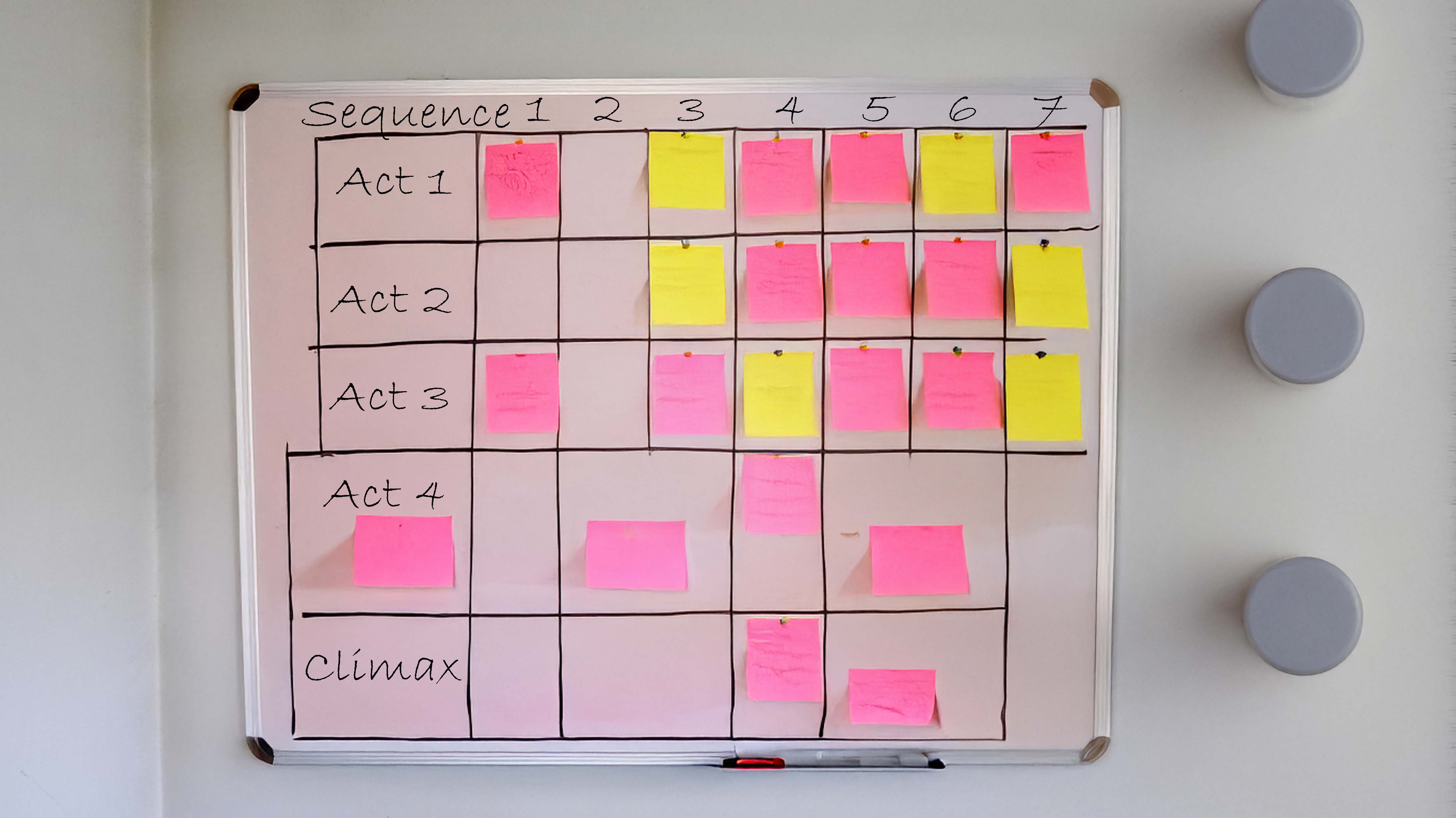 Gemäß den schematischen Vorgaben werden nun für die einzelnen Akte separate Bereiche an der Pinwand markiert und für jeden "Beat", also jede neue Handlungsabfolge einzelne Karteikarten ausgefüllt und angepinnt. Auf diese Weise lässt sich die Konstruktion der jeweiligen Serienfolge sehr gut überblicken.