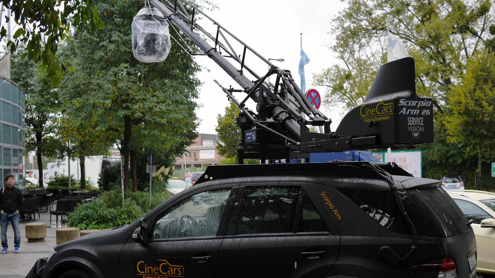 Variante 4: Das Spielauto fährt selbst. Die Kamera befindet sich auf einem zweiten Fahrzeug, welches vorausfährt. Das kann ein Kleinbus sein, aus dem hinten rausgefilmt wird, oder ein PKW mit Schiebedach, in dem das Stativ mit der Kamera durch das Schiebedach ragt. Ist das Aufnahmefahrzeug sehr weich gefedert, ist das eine gute Alternative. Es gibt auch Spezialfahrzeuge, die richtige Sitze und Befestigungsbügel (Scheinwerfer) für Kamera und Assistent auf der Ladefläche bieten. Einige sind auch mit einem kleinen Kran bzw. Ausleger ausgestattet und erlauben es, während der Fahrt seitlich oder von vorne in einer Einstellung in das Spielauto hinein zu filmen.