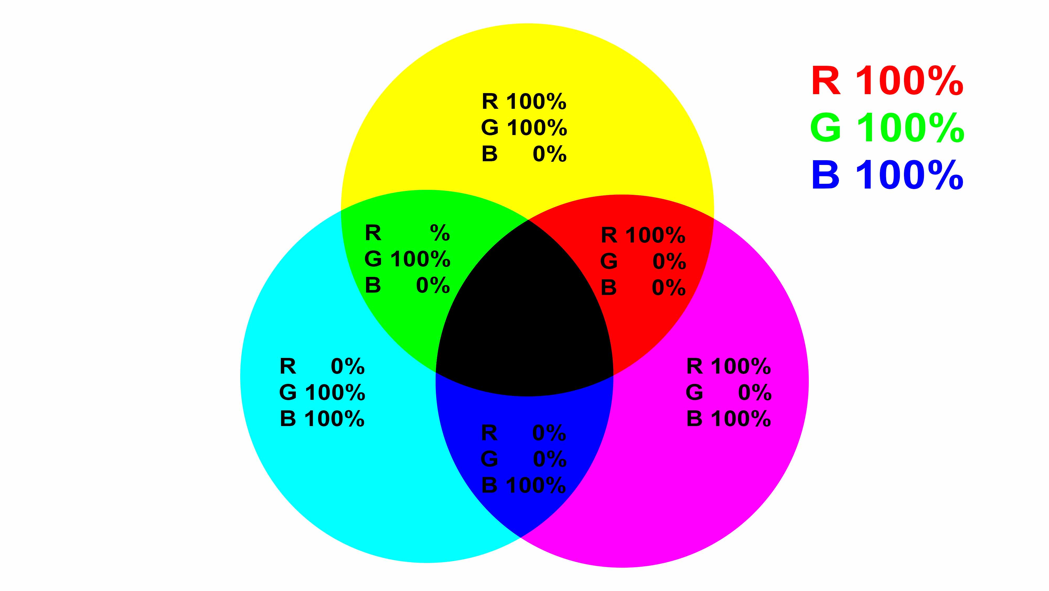 Bei der additiven Farbmischung RGB entsteht aus der Summe der Grundfarben Weiß. Werden nicht alle drei, sondern jeweils nur zwei der Grundfarben additiv gemischt, ergeben sich Gelb (R+G), Purpur (R+B) und Blaugrün (G+B) - die so genannten subtraktiven Farben. Die Farben, die der Mensch wahrnehmen kann, lassen sich durch entsprechende Rot-, Grün- und Blauanteile beschreiben – ein sattes Orange hat 100 % Rotanteil, 50 % Grün und kein Blau.