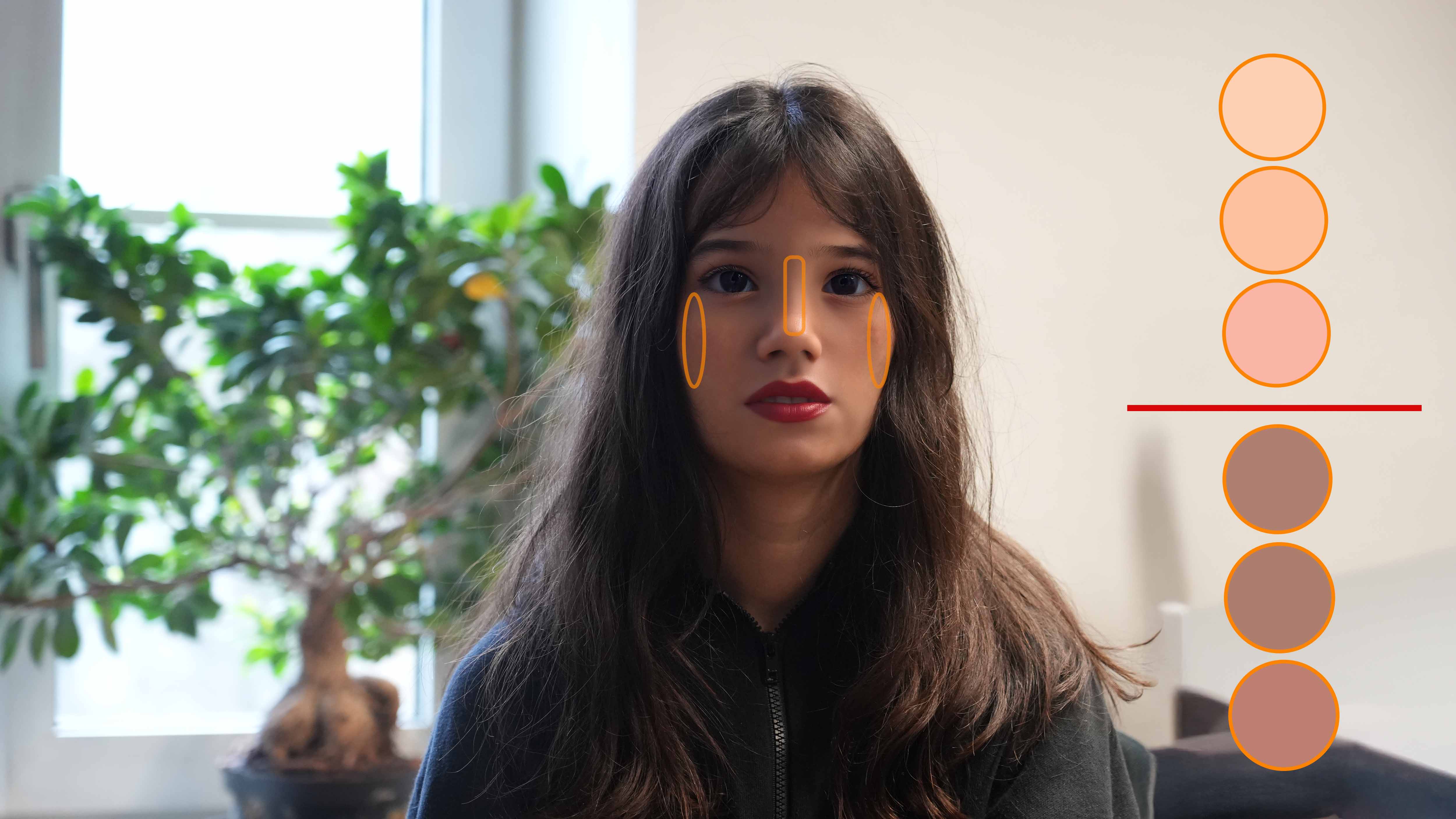 Für das Hervorheben verwendet man umgekehrt Farben, die heller als der Hautton sind. Man muss sich sehr genau überlegen, wo man das einsetzt, das Aufhellen ist nicht dazu gedacht, Elemente im Gesicht zu kaschieren, es hebt alles hervor. Der dunklere Farbton hilft im Zusammenspiel mit gezielter Aufhellung beim Verbergen. Und wie gesagt,- sehr behutsam damit arbeiten, Kameras können sehr schnell entlarvend sein.