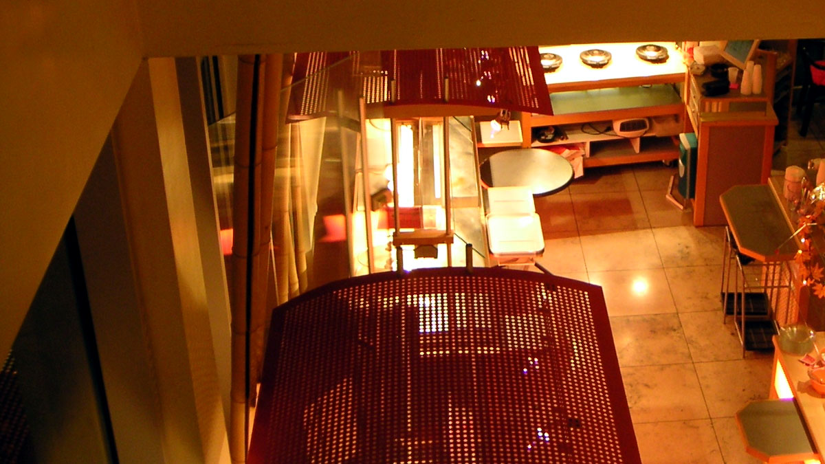Dieses Modell der Zimmerdecke (in der Abb. dunkelgelbes Rechteck vor der Kamera) muss das gleiche Seitenverhältnis haben wie der Raum. Vor der Kamera wird es dann so angebracht, dass die Modelldecke genau dort im Bild ist, wo auch die reale (nicht kostbare) Raumdecke sich befindet.