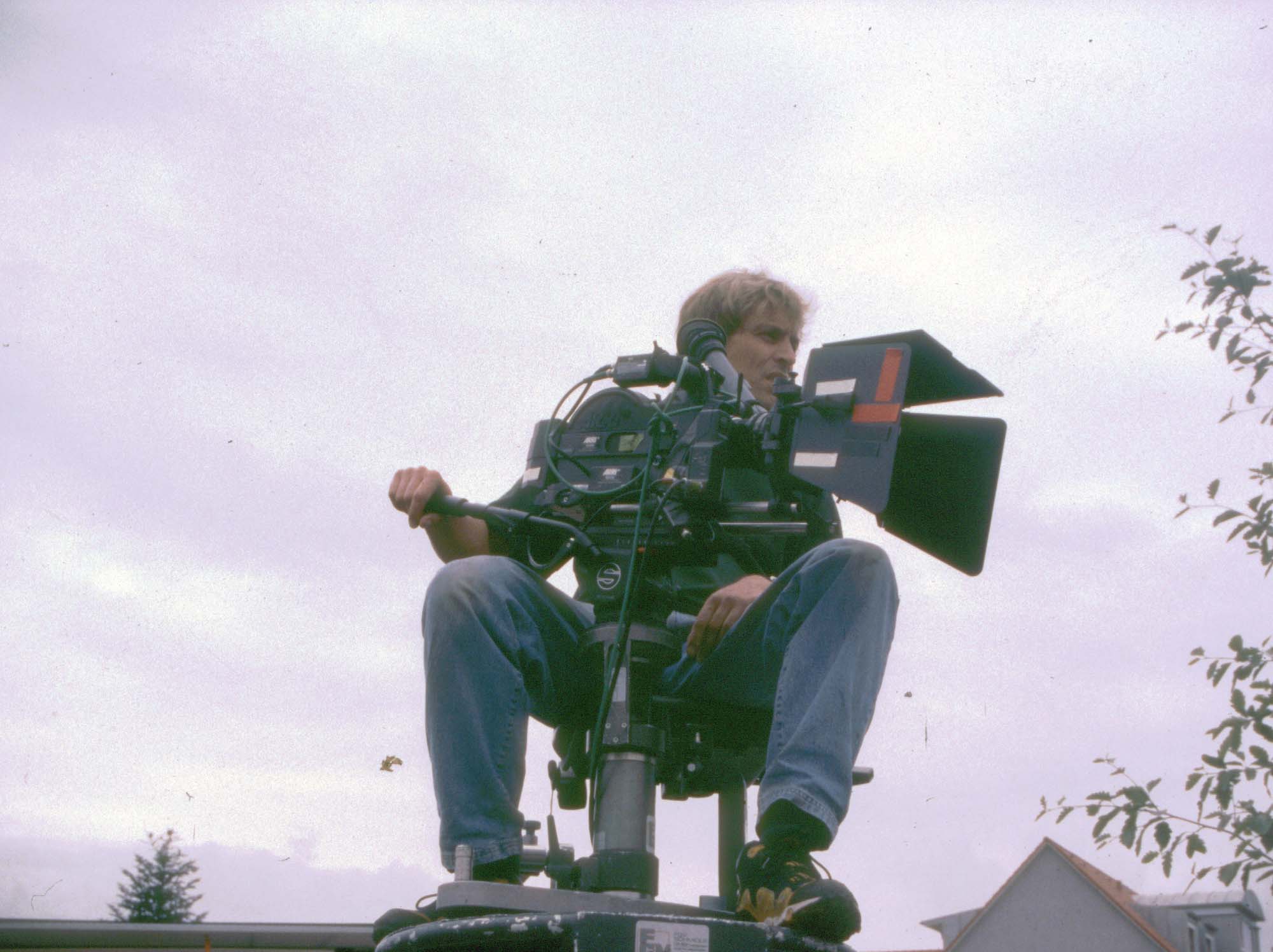 Der Operator sitzt auf einer Plattform und gleicht mit dem Schwenkkopf die Bewegungen des Kranes so aus, dass der gewünschte Bildausschnitt erreicht wird.