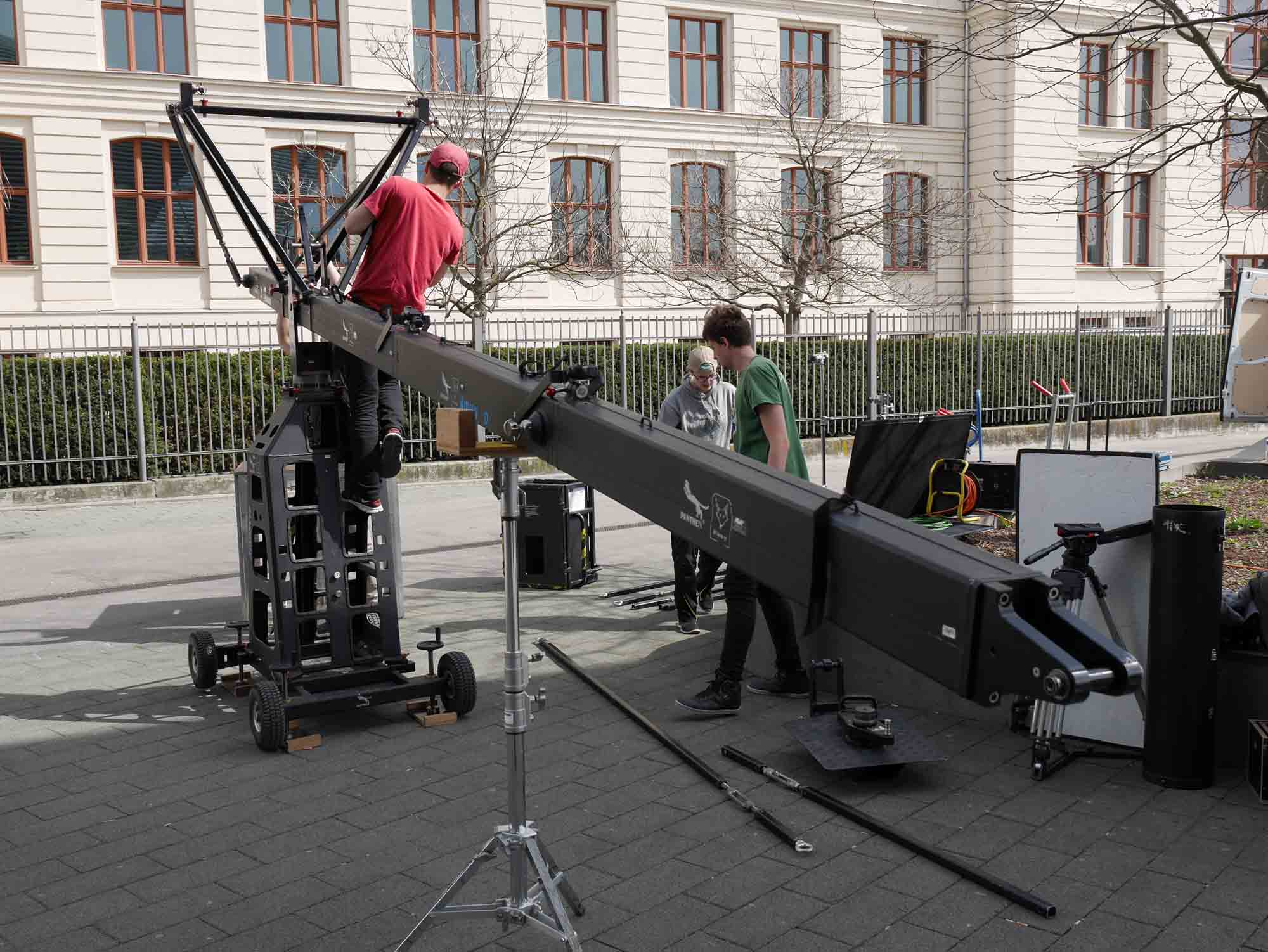 In der einfachsten Variante ist bereit der Jib- Arm, den man auf einen Dolly montieren kann ein Kran, mit dem man etwa 2-3 Höhenmeter überbrücken kann.