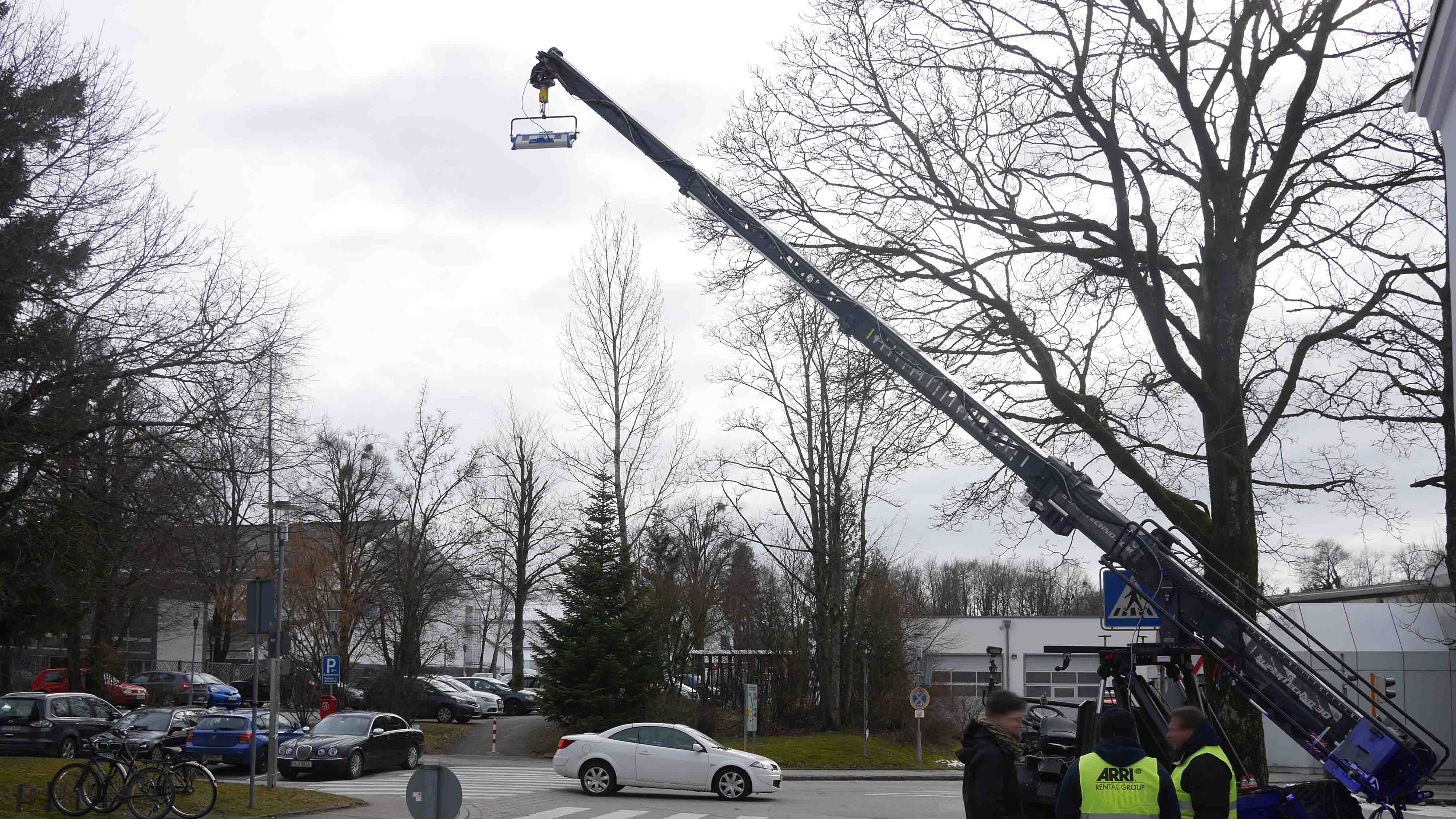 Wenn keine Kranfahrt, sondern lediglich ein Dreh von einer erhöhten Position gewünscht ist, kann auch eine Hebebühne oder ein Skylift verwendet werden. Diese selbstfahrenden Arbeitsbühnen gibt es nicht nur bei diversen Mietfirmen, sondern auch bei der Stadt. Damit werden Straßenlaternen gewartet oder bei den Verkehrsbetrieben Oberleitungen von Straßenbahnen repariert.