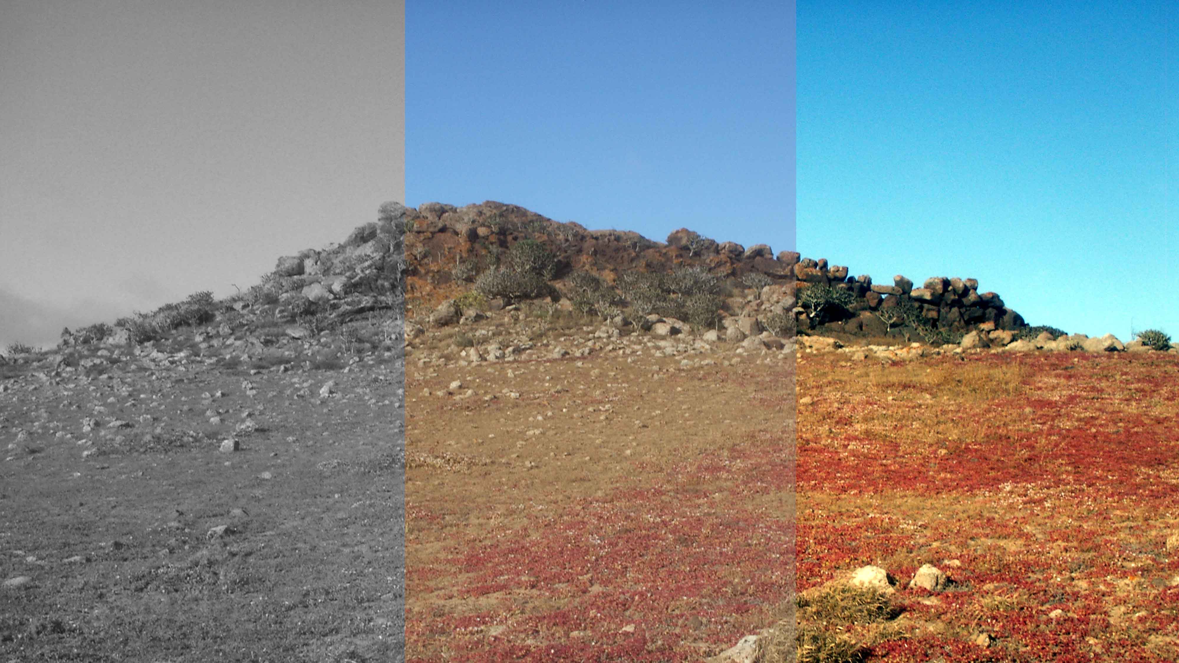 Die unterschiedliche Sensibilisierung bewirkt andere Auswertungen der Helligkeit, jeweils im Rot, Grün und Blau. Während hier schematisch drei Bereiche des Bildes gezeigt werden, sind auf einem CMOS-Chip jeweils benachbarte Pixel nach dem Bayer-Muster (Pattern) für die Grundfarben sensibilisiert. Was die Bildinformationen angeht, so reduziert sich diese um etwa 1/3 bis 1/4. Ein Chip einer Single-Chip-Kamera, der theoretisch 2 Millionen Pixel hat, kann daraus also ein Farbbild von etwa 1,43 bzw. 1,5 Millionen Pixeln errechnen.