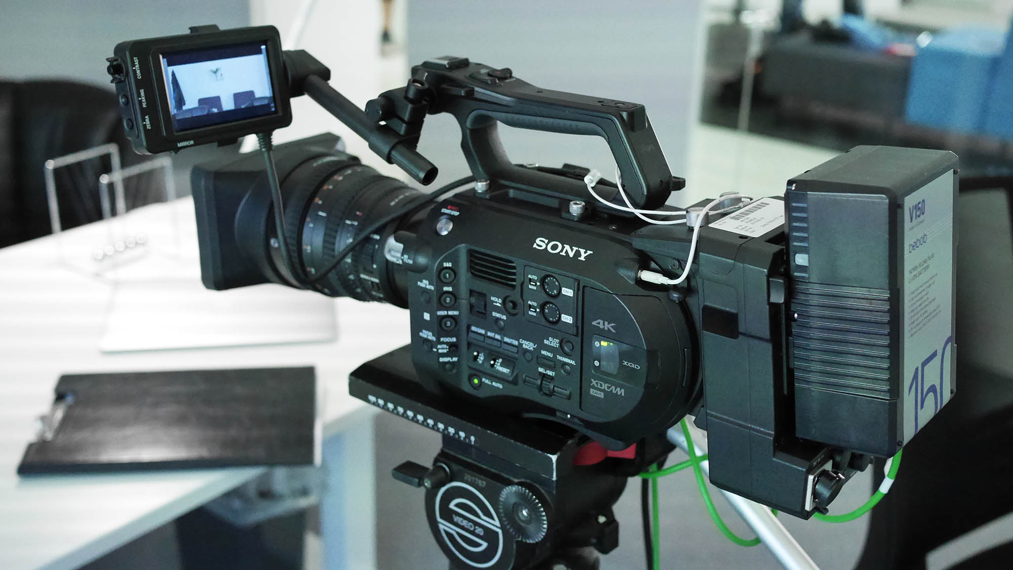 Wenn man statt der Sony- eigenen Akkus einen Adapter für V-Mount benutzt, wird die Kamera besser ausbalanciert und man kann auch am Adapter andere Spannungen für Zubehör abgreifen.