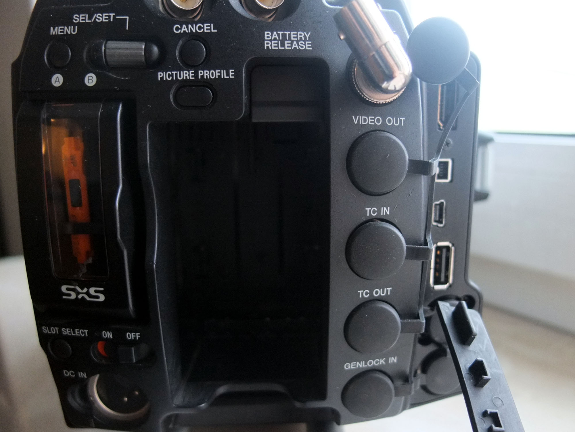 Auf der Rückseite der Kamera finden sich das Akkufach, der SXS Kartenslot und zahlreiche Buchsen, welche die Vielseitigkeit und den professionellen Anspruch der Kamera unterstreichen.