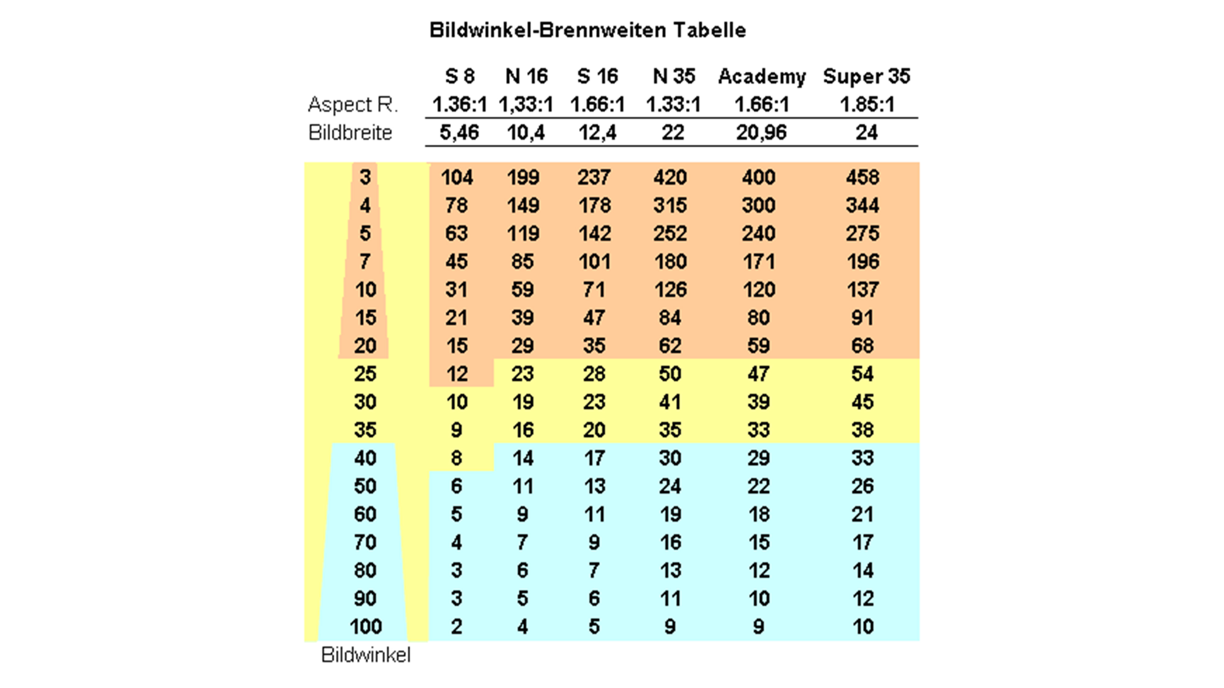 All dies kommt in einer Vielzahl unterschiedlichster Berechnungsformeln, die mal nur die Bildbreite, mal die Diagonale oder die Bildhöhe zur Berechnungsgrundlage nehmen zum Ausdruck.