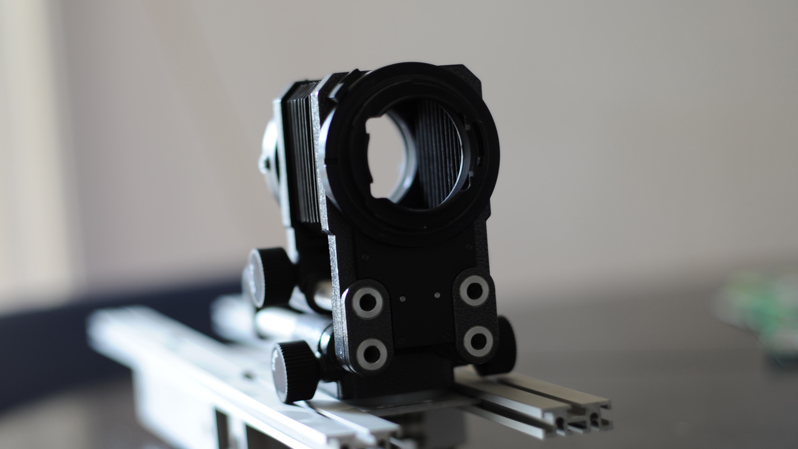 Eine weitere Variante besteht darin, den Abstand zwischen dem Objektiv und dem Sensor / Film zu vergrößern. Dies kann man entweder mit einem Balgenauszug erreichen, der beweglich ist und einen variablen Abstand erlaubt, oder mit einem festen Zusatz, der im Prinzip eine schwarze, lichtdichte Röhre ist, die an einem Ende an den Kamera-Mount angesetzt wird und auf der anderen Seite genau diesen Mount bereitstellt, um das eigentliche Objektiv mit etwas Abstand zu befestigen.
