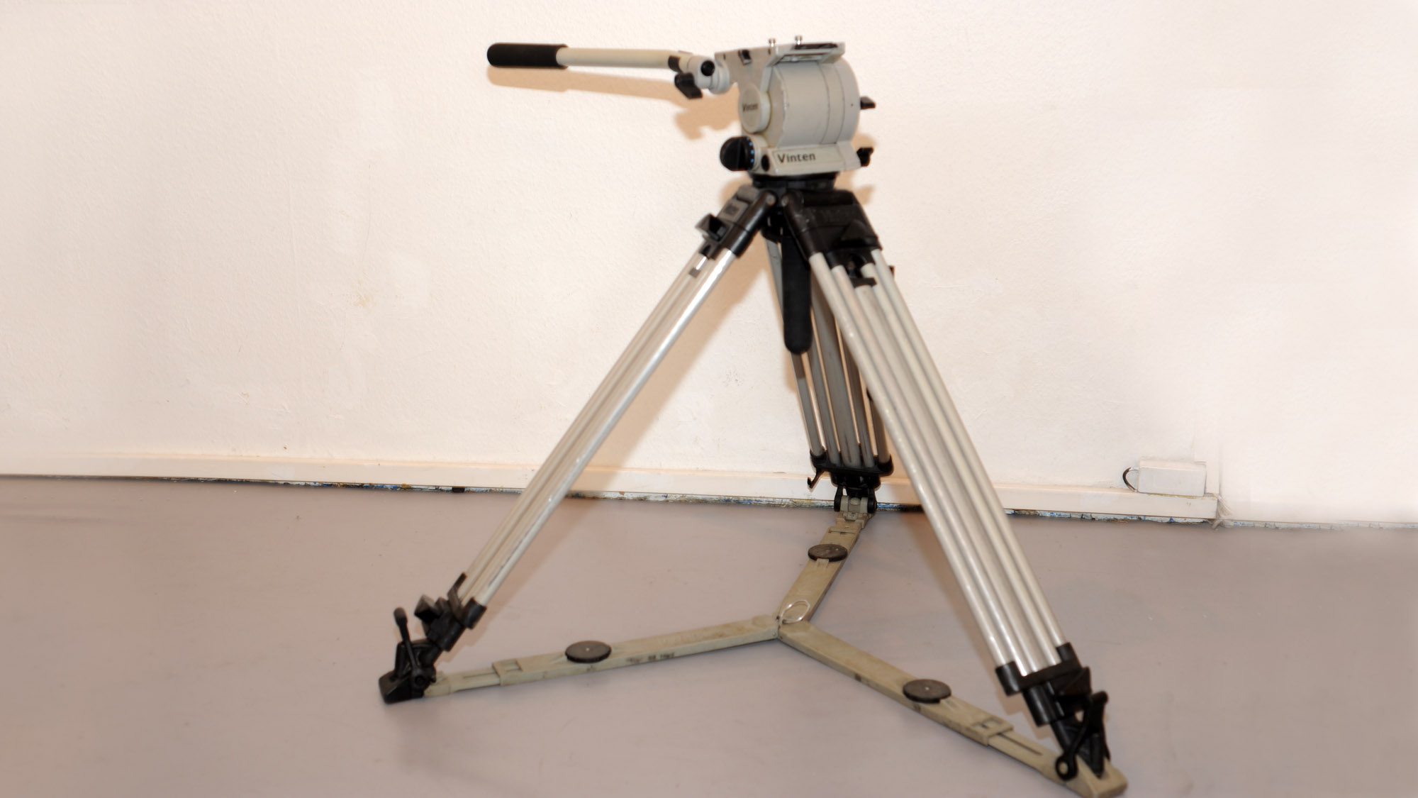 Das passende Vinten-Stativ ist in gleicher professioneller grau-beige Lackierung wie der Schwenkkopf selber und auch die Bodenspinne ist farblich darauf abgestimmt. Selbstverständlich liefert Vinten seine Stative auch in Schwarz aus. Das macht sie weniger auffällig bei Spiegelungen im Motiv. Professionelle Stative von Vinten sind stabil und die Schwenkköpfe ermöglichen weiche, ruhige Schwenks. Dieser Luxus hat seinen Preis, echte hochwertige Fluidheads für 100er Schalen Stative kosten samt Stativbeinen und Spinne zwischen 2.000 und 10.000 Euro je nach Ausführung. Da Köpfe wie der Vision 10 in die Jahre gekommen, aber nach wie vor einwandfrei verwendbar sind, kann man sie auch sehr gut für kleines Geld gebraucht kaufen.
