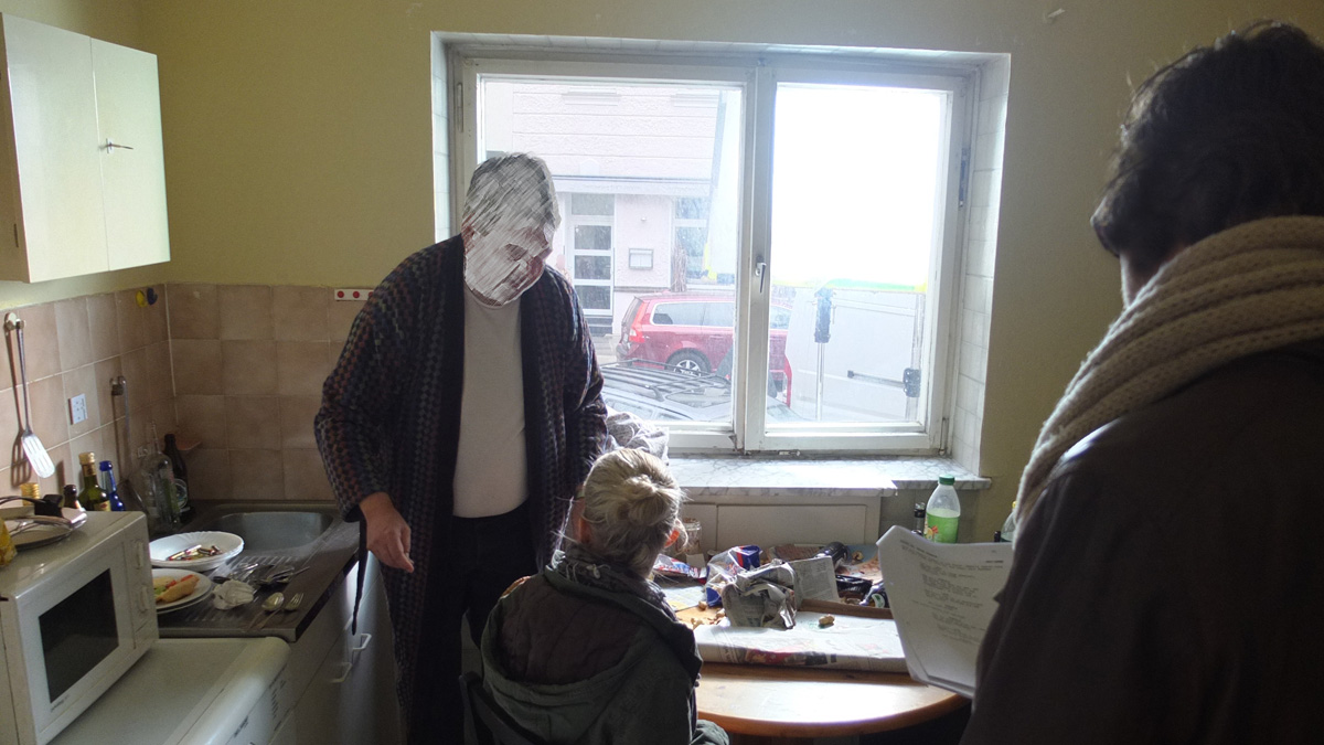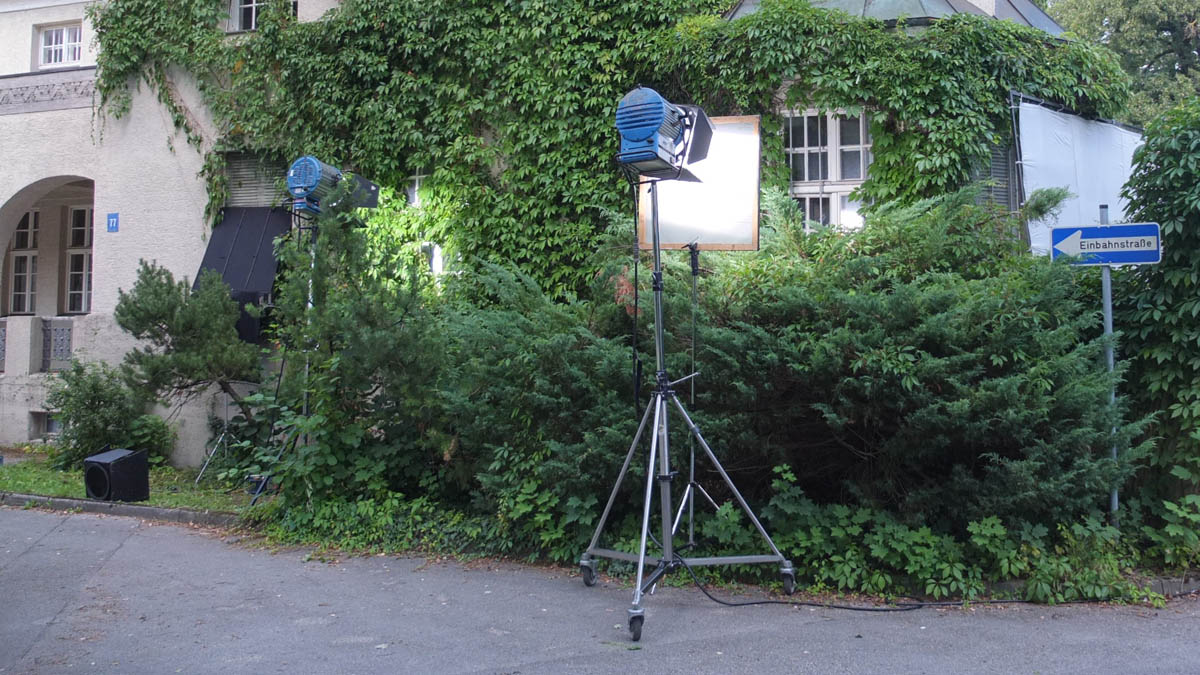 Wenn man also nicht muss, sollte man höhere Etagen vermeiden und besser im Erdgeschoss drehen. Insbesondere leistungsstarke HMI Stufenlinser eignen sich hervorragend, um mit 2500 Watt von Draußen über einen Frostrahmen weiches Tageslicht in die Räume zu werfen. Der Frostrahmen ist deshalb erforderlich, weil der Stufenlinser von seiner Konstruktion her, hartes Licht erzeugt. Da wir aber mit dem Scheinwerfer von Außen das Tageslicht imitieren wollen und dieses bei leicht verhangenem Himmel ein sehr schönes, weiches Licht ist, müssen wir mit einem Frostrahmen oder Butterfly das harte Licht weich machen.