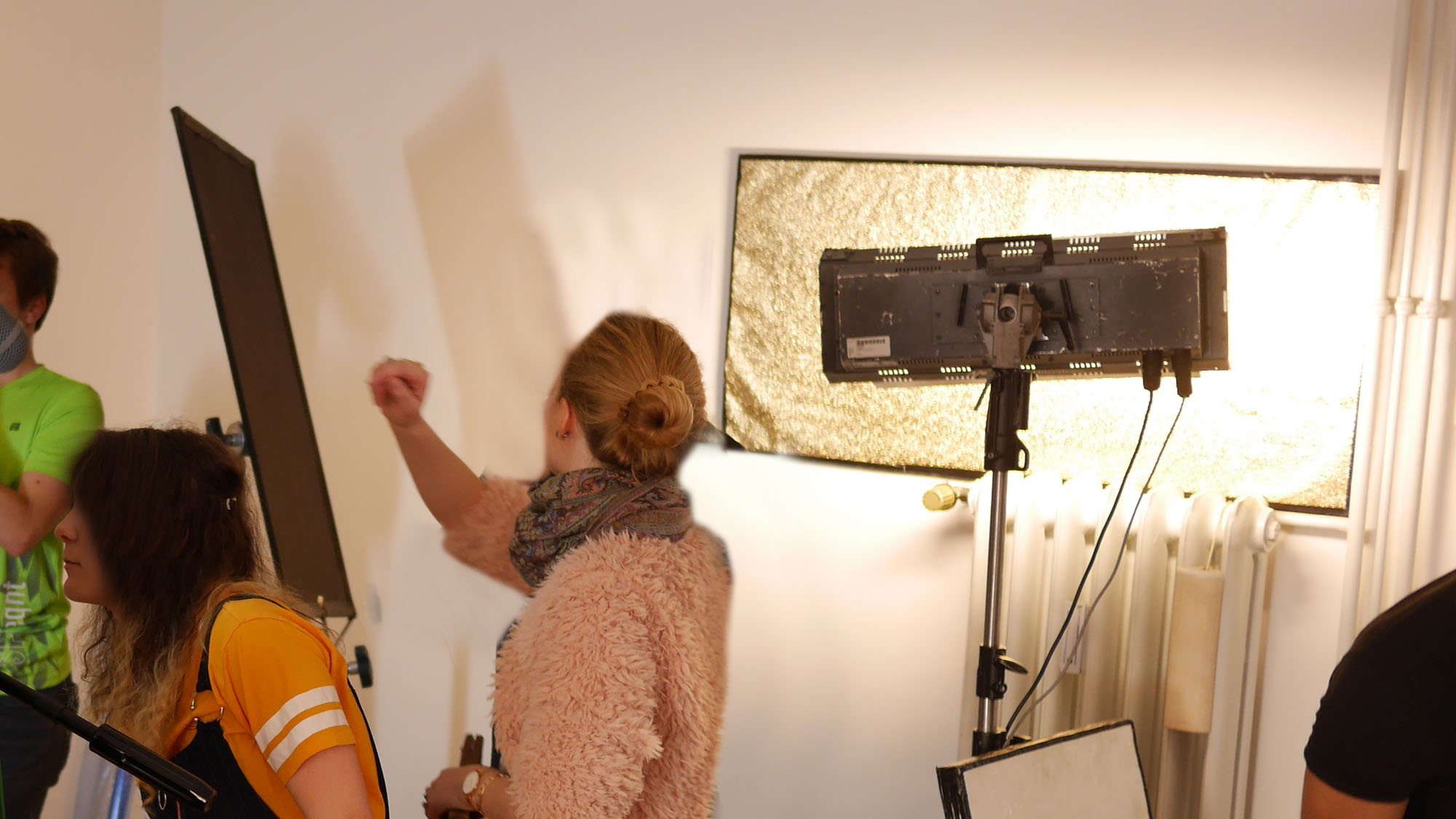 Ganz anders in unserem Beispiel. Die Kamera kommt übrigens seitlich für Schuss / Gegenschuss etwa aus dem Winkel in dem der Tonangler im gelben T-Shirt steht. Hier erhalten die Schauspieler von Hinten in Tageslichtfarbtemperatur vom Sonnenlicht eine Kante in 5600 Kelvin. Eine Two-Bank Fluoreszenzleuchte liefert in einem günstigeren Winkel ein Führungslicht mit etwa 4600 Kelvin (Tageslicht & Kunstlichröhre) und von vorne wird ein Tageslichtscheinwerfer (HMI) über einen Goldreflektor als Aufhellung auf die Schauspieler gelenkt, dessen Farbtemperatur auch eher bei 4600 Kelvin liegt. Eine Glühbirne von oben gibt mit 3600 Kelvin noch einen kleinen Akzent auf die Haare.