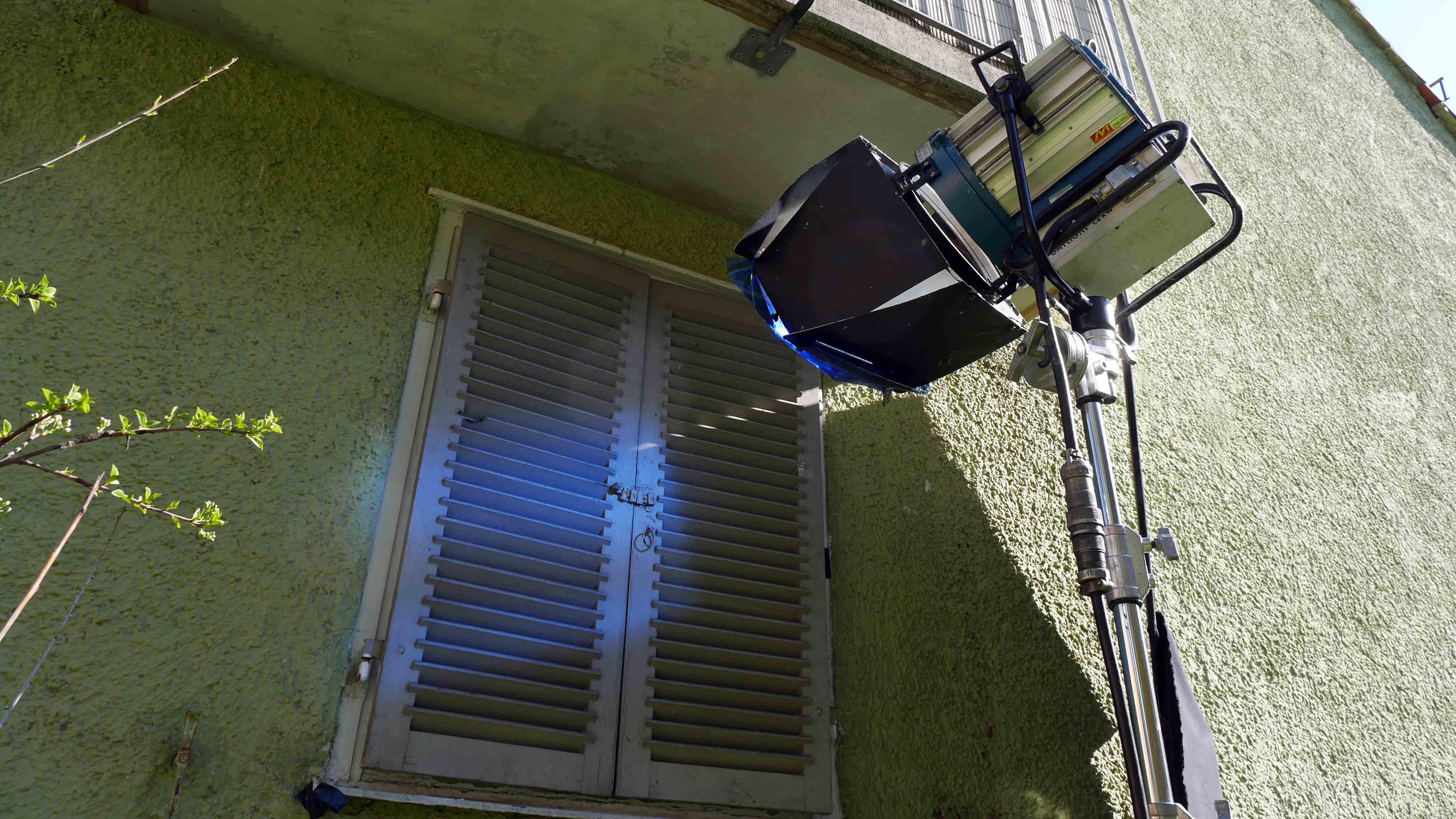 Natürlich kann es auch vorkommen, das man Glück hat und es gibt real verwendbare Jalousien, Fensterläden etc. vor den Fenstern. Dann muss der entsprechende Stufenlinser draußen stehen und durch die Fenster hinein leuchten. Durch die Höhe und Positionierung des Scheinwerfers kann man den Winkel und die Höhe in der die Lichtschlitze im Raum auftreffen, verändern. Achtung: Oft stimmt die Richtung der Lichtschlitze bei Fensterläden trotzdem nicht. Dann kann man diese oft aushängen und verkehrt herum also jeweils die linke und rechte Seite vertauschend,- wieder einhängen. Und schon fallen die Lichtschlitze auf die Gesichter...
