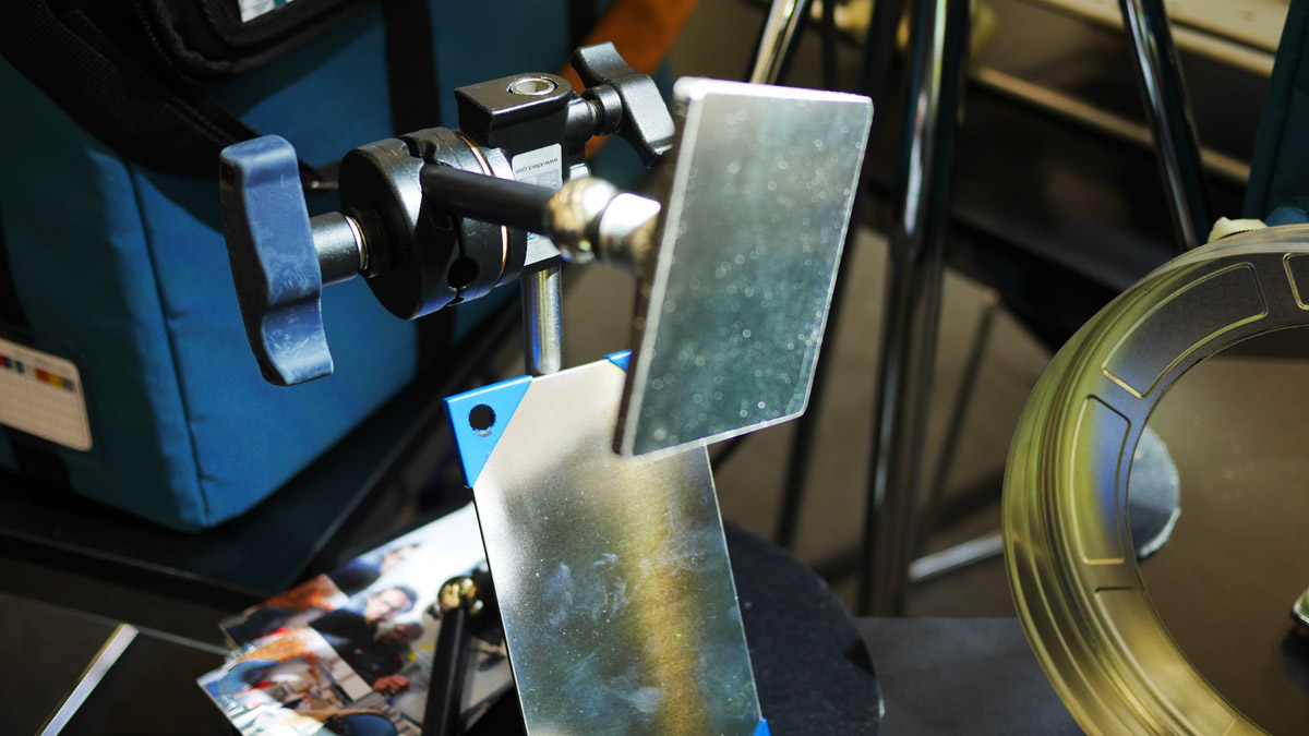 Der Pani-Scheinwerfer, der recht groß und leistungsstark ist und den die Firma Panibeam nennt, wird entweder auf einem Stativ befestigt oder mit der Lichtaustrittsöffnung nach oben, auf dem Boden platziert. Direkt darüber, in Deckenhöhe wird dann der erste Umlenkspiegel platziert, der das stark gebündelte Licht in Richtung der Aufnahmesituation umlenkt. Für die Befestigung und Ausrichtung wurde ein eigenes Grip-System entwickelt, das sogenannte Panigrip.