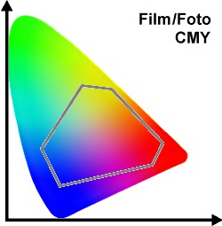 Der Film hat (noch) einen deutlich größeren Spielraum und einen viel größeren Farbraum zu bieten, ist einfach flexibler und die Bilder haben mehr Brillanz, was auch bei einer späteren Bearbeitung noch für Reserven sorgt. Je höher die Qualität des Ausgangsprodukts, desto besser die Bearbeitungsvariationen und die Endprodukte. Die meisten von uns haben diese Erfahrung schon einmal gemacht: Will man ein besonders farbintensives Bild malen, so bieten uns die verschiedenen Farben und Verfahren eine ganz unterschiedliche Brillanz. Mit Öl- oder Lackfarben sind einfach andere Farbkontraste und Dichten möglich, wie etwa mit Kreide oder Buntstiften. Ähnlich verhält es sich mit den verschiedenen Farbtiefen der wichtigsten Bildmedien. Da wir Sie unmöglich gleichzeitig in einen dunklen Kinosaal, vor einen TV-Monitor und in eine digitale Projektion mitnehmen können, lassen sich die verschiedenen Farbräume nur simulieren. Schließlich ist es ein Computerbildschirm, auf dem Sie diese Seite betrachten. Und jeder Bildschirm ist ein wenig anders, daher kann dieser Vergleich nur symbolisch sein. Die folgende Grafik zeigt, wenn Sie mit der Maus über die Links fahren, die Grenzen der verschiedenen Medien auf.