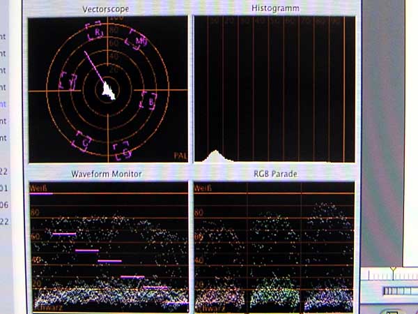 Vectorskop oder ein Waveform-Monitor schaffen klare Aussagen, ob die Farben noch im darstellbaren Bereich liegen. Gemeint sind 75 % Farbe, also dass kein Farbanteil über die 75%-Einzeichnungen am Vektorskop hinaus geht. Inzwischen braucht man nicht unbedingt reale Stand-Alone-Geräte, die professionellen Programme bieten auch sehr gute Software-Messgeräte zur Kontrolle der technischen Parameter.
