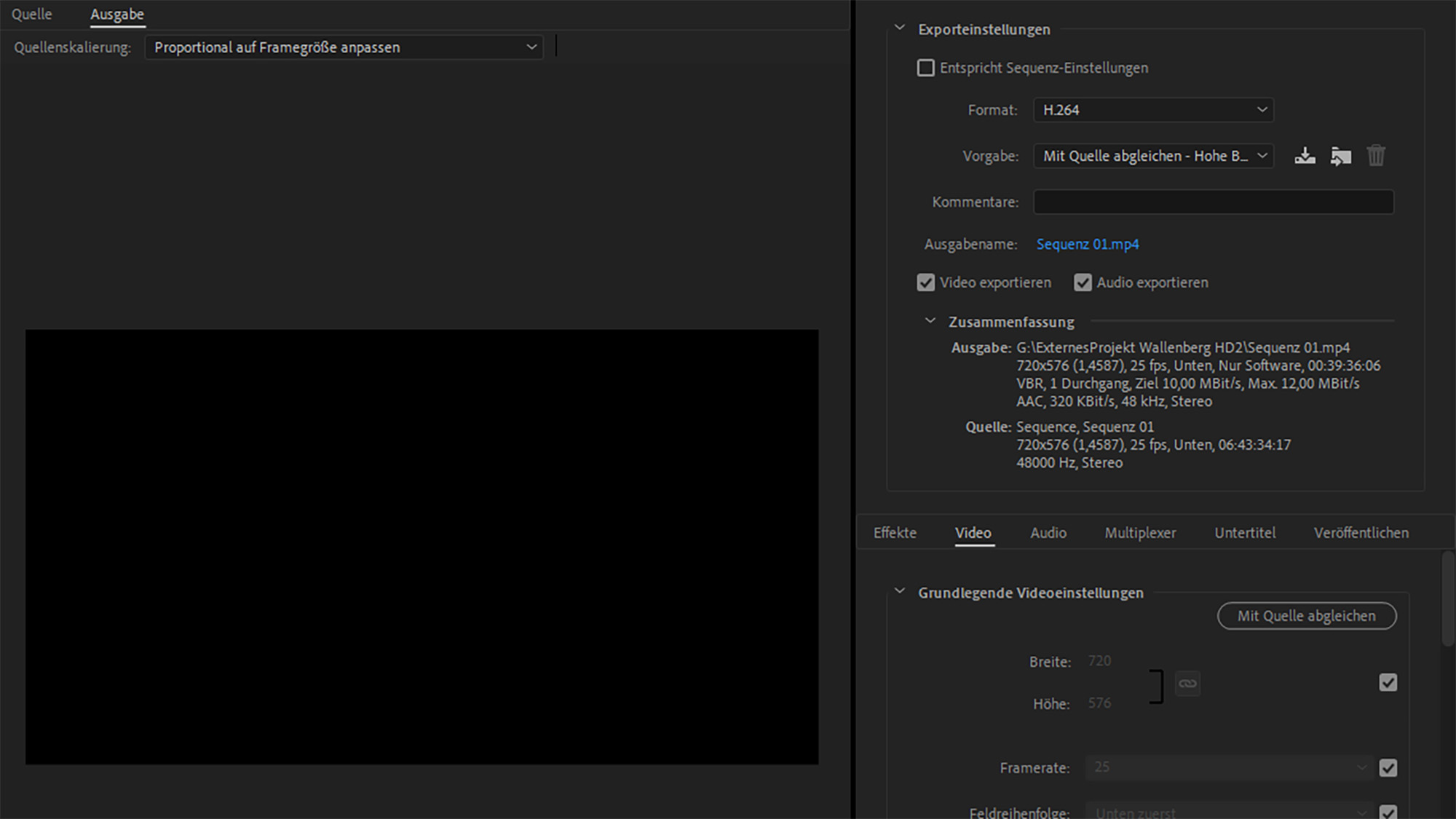 Bei den Einstellungen zur Quelle sollte man "Mit Quelle abgleichen" (Match Source) auswählen. Wenn man den Reiter "Video" öffnet, kann man als Bildrate z.B. "25 B/Sek", als TV Standard "PAL", unter Aspekt "Quadratische Pixel (1,0)" unter Profil "High" unter Level z.B. "4.2" unter Zielbitrate einen hohen Wert z.B. 20 oder 40 Megabit/Sekunde, die maximale Renderqualität anklicken und als Time Interpolation "Frame Sampling" wählen.