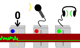 Die Laufrichtung des Bandes ist von links nach rechts. Das Tonsignal ist auf dem Band als grüne Kurve dargestellt. Die Köpfe: Löschkopf (blau), Aufnahmekopf (rot), Wiedergabekopf (grün)