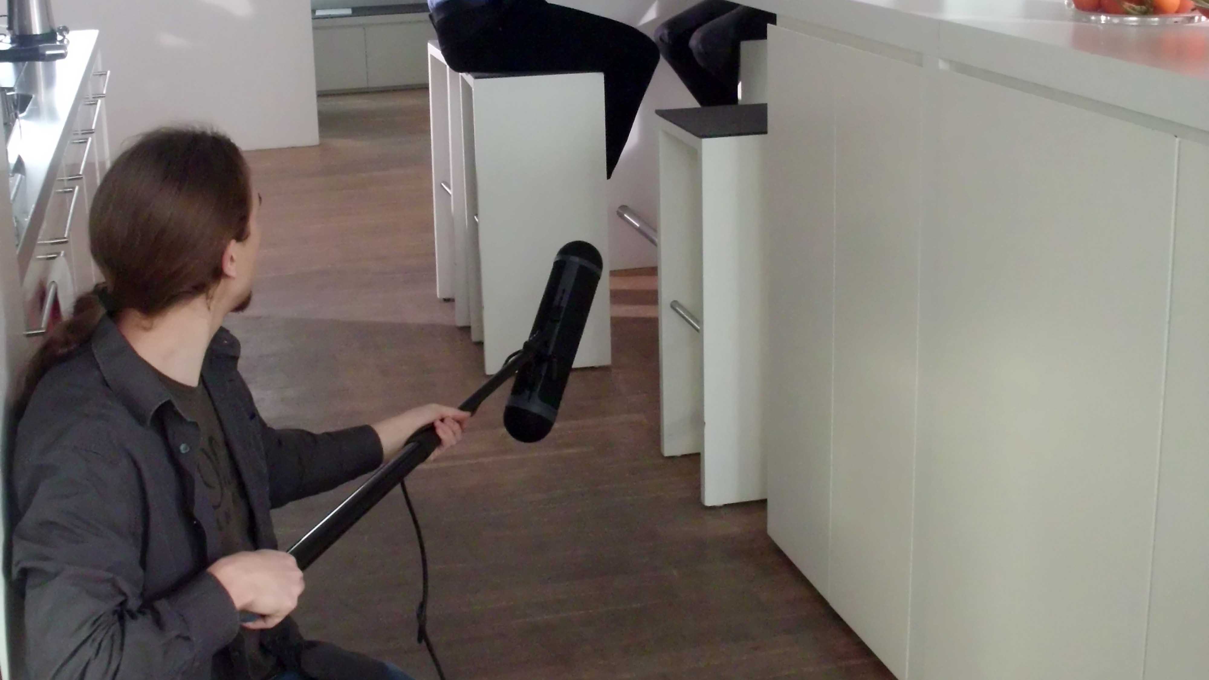 Der / die Tonassistent*In (Angler/Boommann) versucht deshalb, so nahe wie möglich an den Mund der Schauspieler*Innen zu gelangen, ohne, dass das Mikro im Bild zu sehen ist (Angeln). So bekommt man den Ton möglichst direkt (roter Pfeil); die Reflektionen haben einen geringen Anteil am Signal.