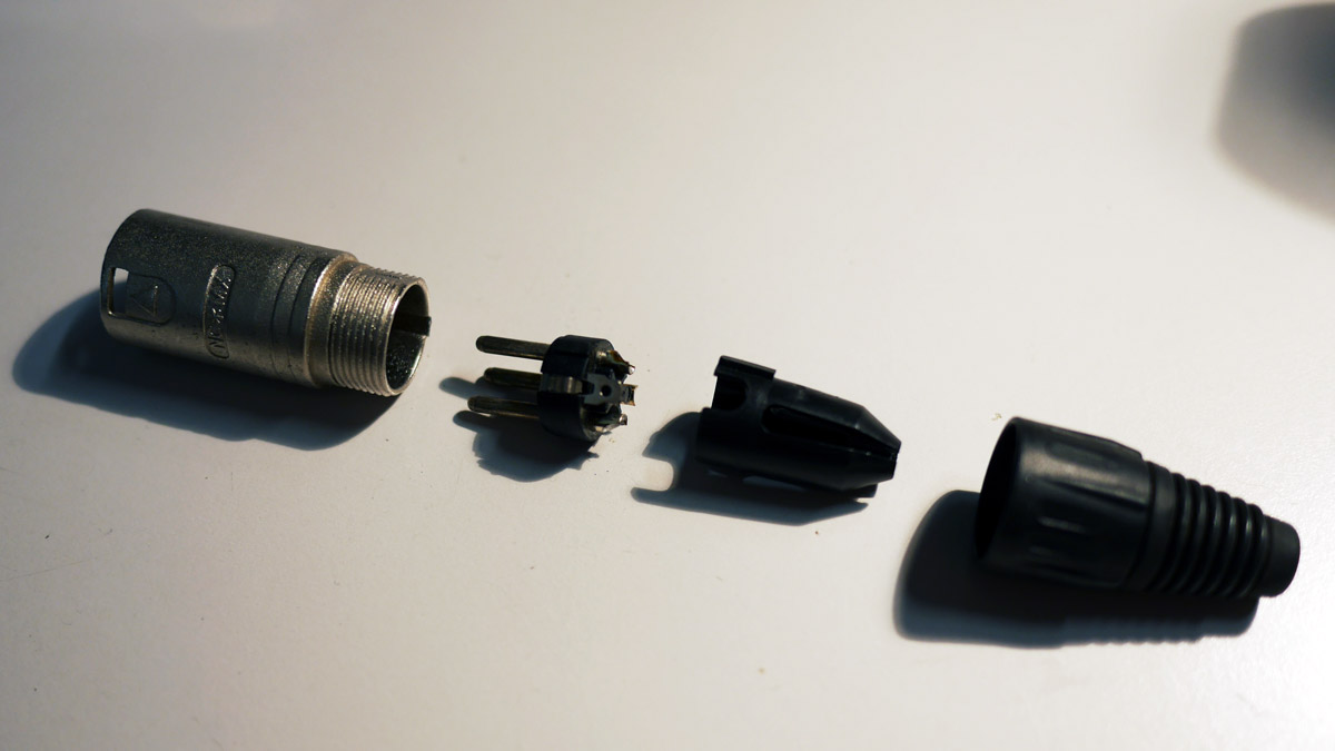 Im XLR-Stecker (oder Kupplung) werden die Pole 1 und 3 überbrückt. Pin 1 wird an die Masse, also die Abschirmung unseres Kabels, angelötet. An Pin 2 kommt die Ader. Dies macht aus dem symmetrischen Signal ein asymmetrisches. Auf der Seite des Klinkensteckers lötet man die Masse an die längste, untere Lötfahne, und die Ader an eine der beiden kurzen, mittleren Lötfahnen, je nachdem, ob der linke oder rechte Kanal belegt werden soll. Der andere Pin wird mit der Masse verbunden.