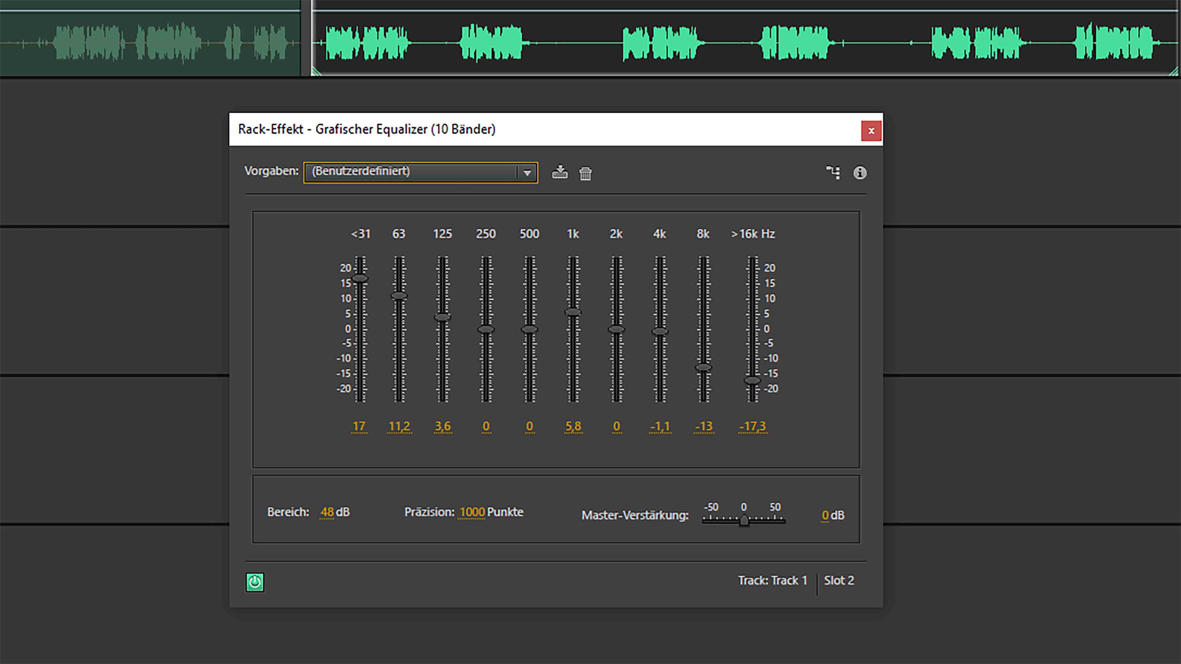 Als weiteren Effekt legt man den 10 Band Equalizer darüber, reduziert die Höhen und verstärkt die Bässe. Als nächstes legt man einen Kompressor darüber und zuletzt den Flanger Effekt, der das Signal zwischen den beiden Stereokanälen hin und herwandern lässt.