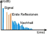 Das Verhältnis von Direkt- zu Diffusschall bestimmt, wie weit entfernt uns ein Klang erscheint. Ein Klang ohne Hall drängt sich in den Vordergrund, während ein höherer Hallanteil eine größere Entfernung der Schallquelle suggeriert. Wichtig für die Richtungswahrnehmung sind die ersten Reflektionen (Early Reflections). Die Schallquelle wird in der Richtung geortet, wo die ersten Reflektionen herkommen.