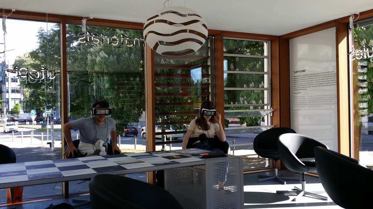 Leider befindet sich der Loftcube just in der Mitte zwischen mehreren stark befahrenen Straßen und der Lärm ist auch in dem Pavillon unüberhörbar. Das ist der VR Illusion nicht immer zuträglich, andrerseits macht der Design Klassiker als Location natürlich visuell Eindruck.