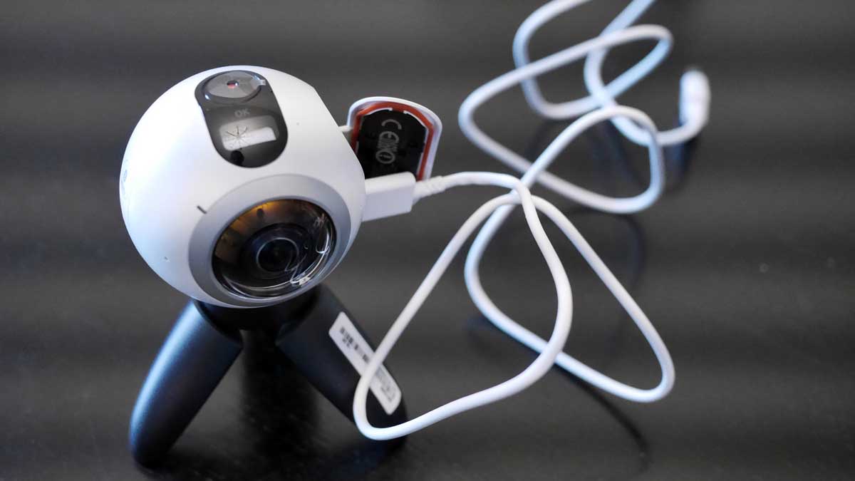 Vor dem ersten Benutzen soll man den Akku, der erfreulicherweise separat und nicht fest in das Gehäuse verbaut ist, aufladen. Da beginnt schon die erste Irritation, denn wenn die Kamera eingeschaltet ist, wird nirgendwo angezeigt, dass da irgendetwas geladen wird. Keine LED, nichts... Woran soll man erkennen, dass der Akku aufgekladen ist? Das Rätsel löst sich erst per Trial & Error,- im eingeschalteten Zustand lädt die Gear 360 nicht auf. Nur wenn die Kamera ausgeschaltet ist, wird als Indikator eine Led auf der Seite der Taster angezeigt.