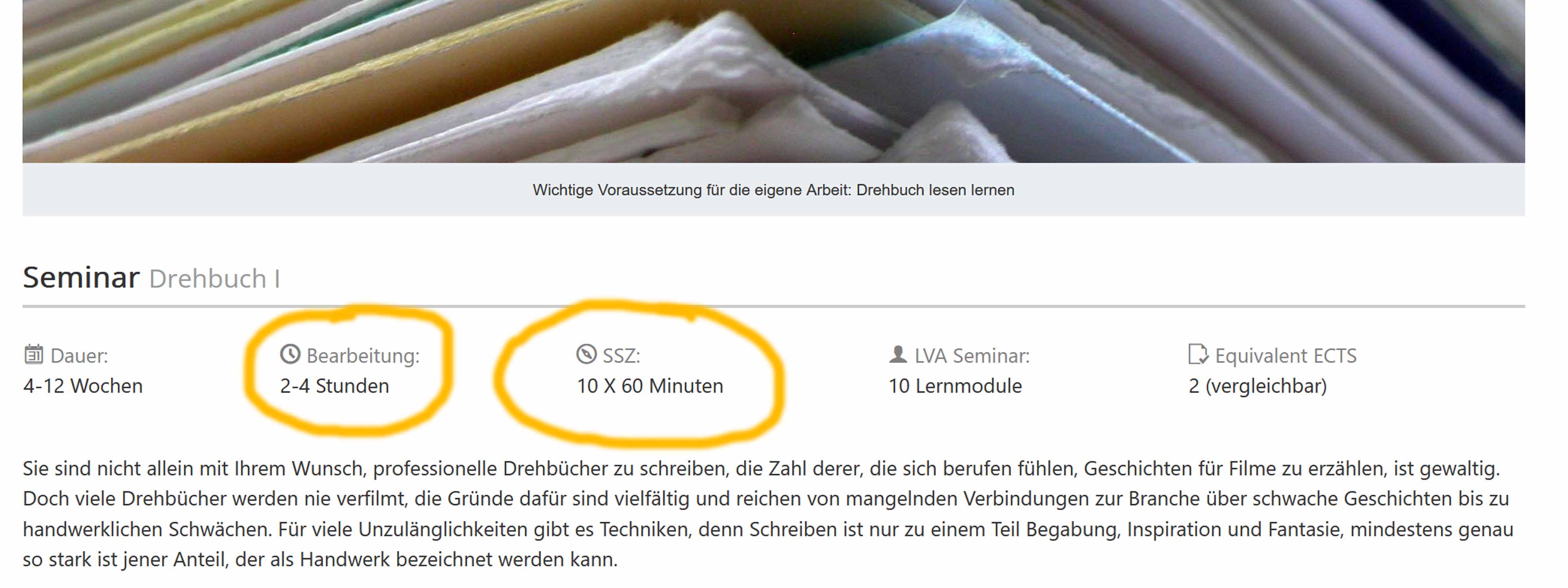 Die dritte Angabe (10 X 60 Minuten) ist die durchschnittliche "Selbststudienzeit" (SSZ), also die Zeit, die Sie sich selbst beispielsweise mit dem in diesem Seminar ausgewählten Drehbuch, mit internen und externen Seiten (siehe Lernmaterialien), mit Linkhinweisen ihres Tutors / Ihrer Tutorin oder auch mit Fachliteratur befassen.