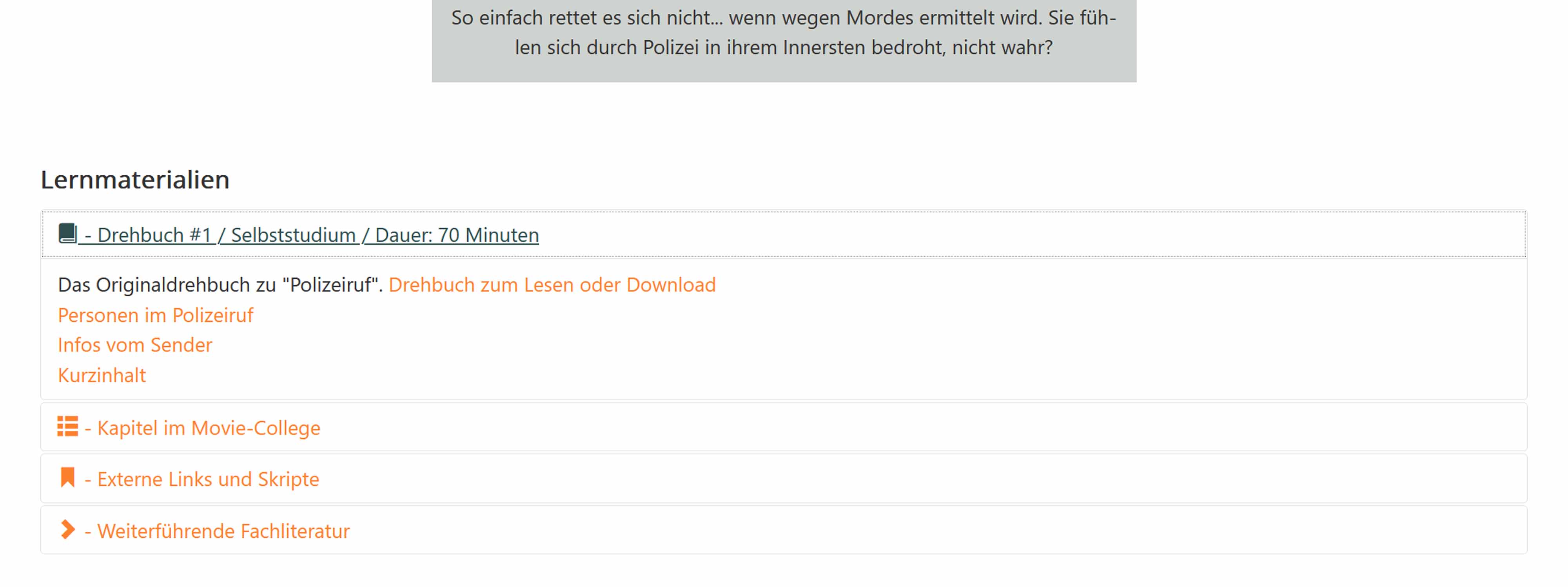 In diesem Bereich finden Sie zunächst einmal Materialien, die für das Seminar zwingend erforderlich sind, etwa ein Drehbuch als PDF. Danach folgt ein Menüpunkt mit dem Sie interne Seiten zum Thema Drehbuch finden können, welche bei den verschiedenen Lernmodulen / Aufgabenseiten hilfreich sind. Ein weiterer Menüpunkt führt zu externen Seiten, die ebenfalls für die Lernmodule hilfreich sein können. Der letzte Menüpunkt öffnet eine Auswahl von Fachliteratur, die empfehlenswert ist.
